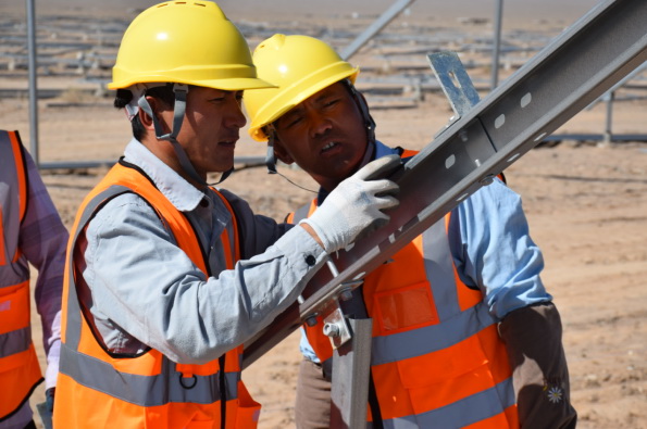 在樁基施工過程中,克服作業(yè)面環(huán)境惡劣、氣溫高紫外線強(qiáng)、常伴有沙塵暴等因素,以每日、每周為節(jié)點(diǎn)嚴(yán)格落實(shí)施工部署,優(yōu)化工序施工方案,采取測(cè)量放點(diǎn)精準(zhǔn)定位,樁位中心清晰標(biāo)識(shí),樁機(jī)安裝水平尺,專人盯控預(yù)埋件,有效避免樁位、樁身垂直度、樁長、樁頂標(biāo)高、預(yù)埋件定位等工序風(fēng)險(xiǎn)點(diǎn)出現(xiàn),5月27日優(yōu)質(zhì)完成樁基混凝土澆筑,為項(xiàng)目安全快速推進(jìn)奠定了堅(jiān)實(shí)的基礎(chǔ)。8月12日,玉門40萬千瓦光伏發(fā)電工程項(xiàng)目首批次光伏板順利安裝,項(xiàng)目正式進(jìn)入電氣安裝階段,同時(shí)開啟了建設(shè)目標(biāo)“加速度”。10月30日項(xiàng)目提前40天順利完工。