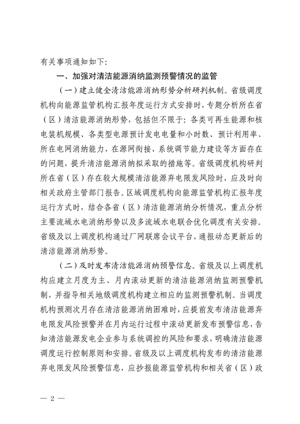 第一部分是加強(qiáng)對(duì)清潔能源消納監(jiān)測(cè)預(yù)警情況的監(jiān)管。包括建立健全清潔能源消納形勢(shì)分析研判機(jī)制、及時(shí)發(fā)布清潔能源消納預(yù)警信息。要求調(diào)度機(jī)構(gòu)做好清潔能源消納形勢(shì)全面分析匯報(bào)工作,建立清潔能源消納監(jiān)測(cè)預(yù)警機(jī)制,預(yù)測(cè)存在消納困難時(shí),提前發(fā)布棄電限發(fā)風(fēng)險(xiǎn)預(yù)警并滾動(dòng)更新信息,按規(guī)定報(bào)送能源監(jiān)管機(jī)構(gòu)和相關(guān)?。▍^(qū))政府主管部門。發(fā)電企業(yè)要加強(qiáng)水情和新能源功率預(yù)測(cè)系統(tǒng)運(yùn)行和應(yīng)用,提高準(zhǔn)確性和時(shí)效性。