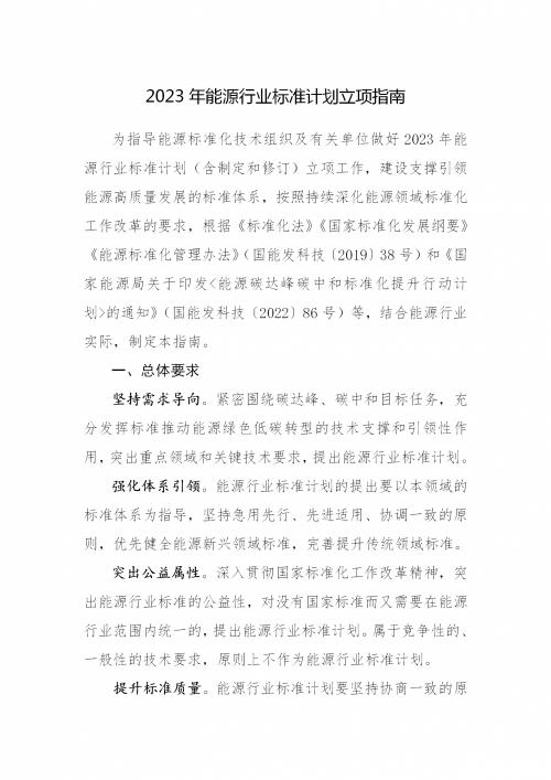 為進(jìn)一步提升能源行業(yè)標(biāo)準(zhǔn)立項(xiàng)工作的計(jì)劃性、導(dǎo)向性,根據(jù)國(guó)家能源局標(biāo)準(zhǔn)化工作安排,結(jié)合落實(shí)《能源碳達(dá)峰碳中和標(biāo)準(zhǔn)化提升行動(dòng)計(jì)劃》重點(diǎn)任務(wù),我局組織編制了《2023年能源行業(yè)標(biāo)準(zhǔn)計(jì)劃立項(xiàng)指南》?,F(xiàn)印發(fā)給你們,請(qǐng)按照指南明確的要求,做好能源行業(yè)標(biāo)準(zhǔn)計(jì)劃立項(xiàng)工作。