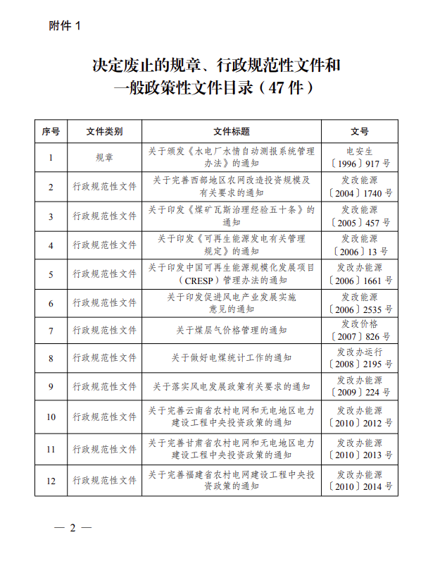 經(jīng)過(guò)清理,決定對(duì)47件規(guī)章、行政規(guī)范性和一般政策性文件予以廢止,其中包括《關(guān)于完善光伏發(fā)電規(guī)模管理和實(shí)行競(jìng)爭(zhēng)方式配置項(xiàng)目的指導(dǎo)意見(jiàn)》等多項(xiàng)跟光伏、風(fēng)電能源領(lǐng)域有關(guān)文件。