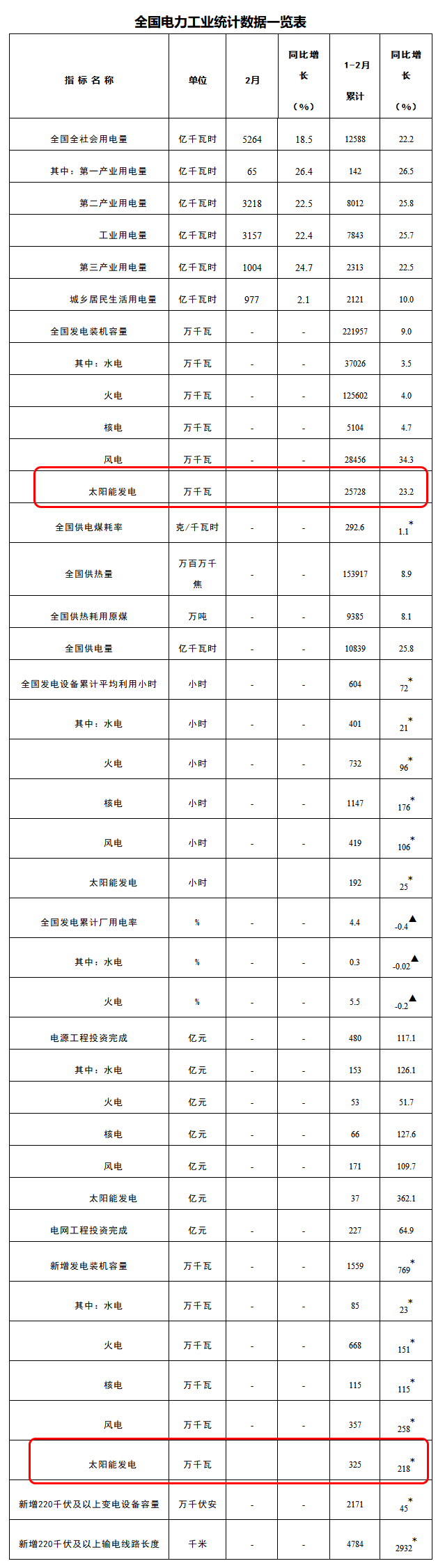 今年1-2月份,全國全社會用電量為12588億千瓦時,同比增長22.2%。全國發電裝機容量為221957萬千瓦,同比上漲9%;其中太陽能發電裝機容量25728萬千瓦,同比增長23.2%。