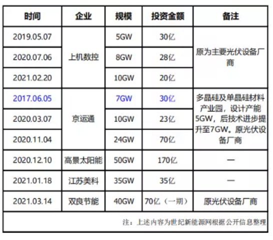 京運通創(chuàng)立之初,業(yè)務并未涉及單晶硅業(yè)務,光伏設(shè)備為其主要支撐,與賽維LDK的“糾葛”在業(yè)內(nèi)較為知名。2017年6月5日,京運通發(fā)布公告稱,與內(nèi)蒙古烏海市政府簽署了《烏海京運通新材料產(chǎn)業(yè)園項目投資協(xié)議》,就建設(shè)設(shè)計5GW多晶硅及單晶硅材料為主的產(chǎn)業(yè)園區(qū)達成合作意向,總投資約為30億元。后由于技術(shù)進步,該項目產(chǎn)能提升至7GW。2020年3月、2020年11月,京運通邁出了擴產(chǎn)的步伐。從2020年年末至2021年1月,短短20天時間,京運通與晶澳、江蘇新潮、通威、江蘇潤陽悅達簽署高達168億單晶硅長單。