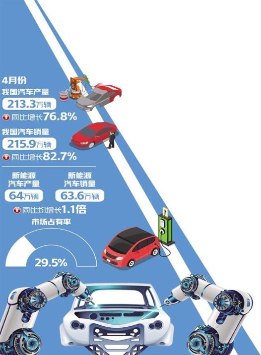 伴隨宏觀經(jīng)濟(jì)持續(xù)恢復(fù)向好,市場需求逐步回暖,汽車消費(fèi)需求有望進(jìn)一步釋放。中汽協(xié)發(fā)布數(shù)據(jù)顯示,4月份,我國汽車產(chǎn)銷分別完成213.3萬輛和215.9萬輛,同比分別增長76.8%和82.7%。其中,新能源汽車產(chǎn)銷和汽車出口延續(xù)良好態(tài)勢。