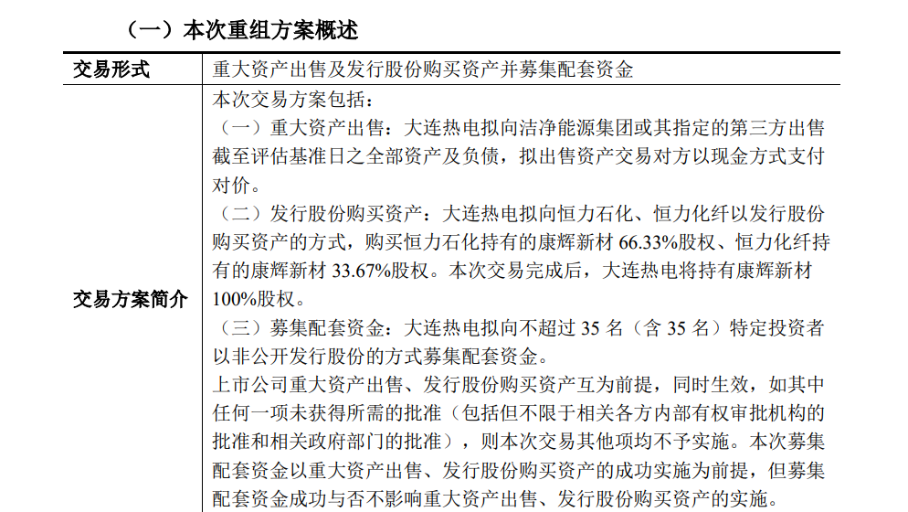 本次分拆完成后,大連熱電將會成為康輝新材的控股股東。其擬通過向康輝新材全體股東發(fā)行股份購買其合計(jì)持有的康輝新材100%股份,進(jìn)而實(shí)現(xiàn)恒力石化分拆康輝新材重組上市。這在A股還是首次。