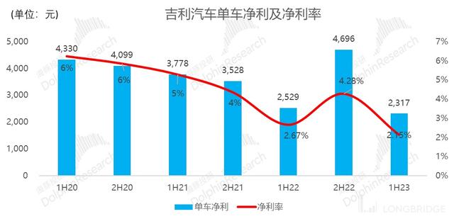 2023 年上半年吉利汽車實(shí)現(xiàn)歸母凈利潤 15.7 億元,同比增長約 1%,略超市場(chǎng)預(yù)期 15.1 億元。但凈利率下滑從 2022 年上半年 2.7% 下滑至 2023 年上半年 2.2%, 單車凈利也從 2529 元降低至 2317 元。