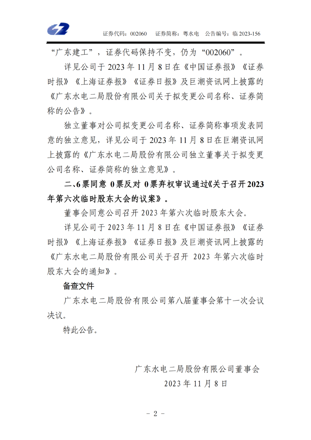 11月8日,粵水電發(fā)布公告稱,董事會同意將公司名稱由廣東水電二局股份有限公司變更為廣東省建筑工程集團股份有限公司。