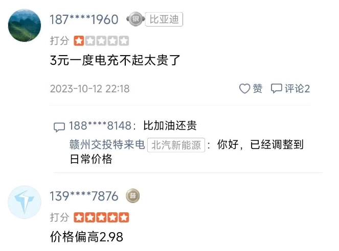 但是在評論區(qū)里,有多名不同手機號的用戶吐槽“電價過貴”的發(fā)言。2023年10月15日左右,先后有幾名網(wǎng)友責(zé)怪:“價格偏高2.98元”“3元一度電充不起太貴了”……當(dāng)時,贛州交投特來電于去年10月13日回復(fù)道:已經(jīng)調(diào)整到日常價格。