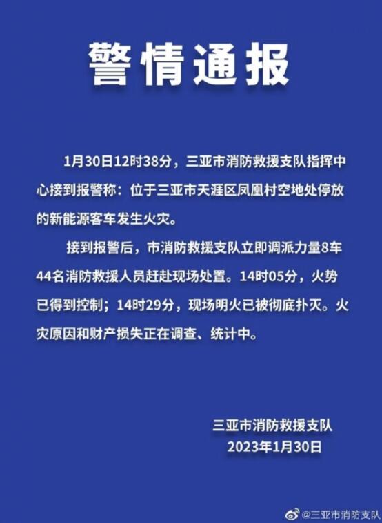 另據(jù)三亞市消防支隊通報稱,30日12時38分,三亞市消防救援支隊指揮中心接到報警稱:位于三亞市天涯區(qū)鳳凰村空地處停放的新能源客車發(fā)生火災(zāi)。支隊調(diào)派8車44名消防救援人員趕赴現(xiàn)場處置。14時05分,火勢已得到控制;14時29分,現(xiàn)場明火已被徹底撲滅?;馂?zāi)原因和財產(chǎn)損失正在調(diào)查、統(tǒng)計中。