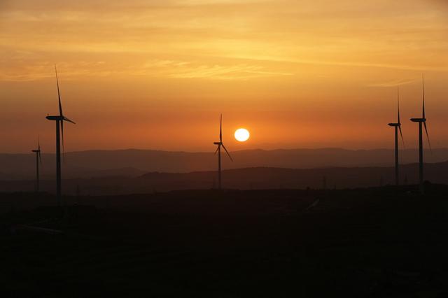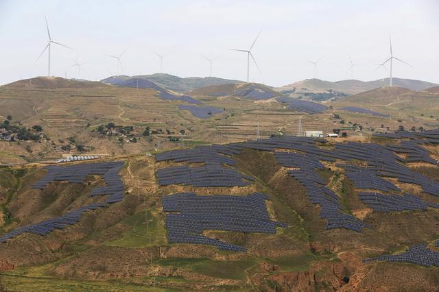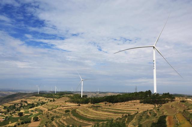 夏日時節(jié),在位于黃土高原的甘肅省定西市,風(fēng)電基地風(fēng)機(jī)迎風(fēng)旋轉(zhuǎn),與梯田、村莊相映成景,蔚為壯觀。