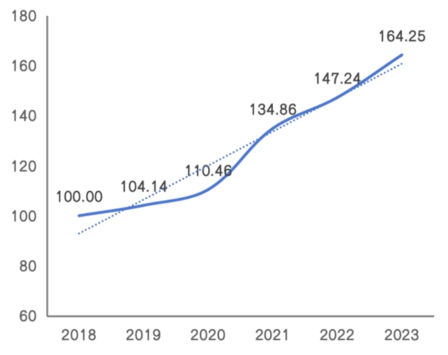 指數(shù)結(jié)果顯示,2023年,內(nèi)蒙古現(xiàn)代能源經(jīng)濟(jì)發(fā)展指數(shù)高速增長,達(dá)164.25點(diǎn),同比增長11.55%,基期以來年均復(fù)合10.43%,發(fā)展質(zhì)速較前期進(jìn)一步提升。從分項(xiàng)指數(shù)看,低碳轉(zhuǎn)型、創(chuàng)新驅(qū)動、經(jīng)濟(jì)高效和社會貢獻(xiàn)四大維度發(fā)展均穩(wěn)中向好、好中有進(jìn)、進(jìn)中蓄勢,在錯綜復(fù)雜的國內(nèi)外形勢挑戰(zhàn)下彰顯了內(nèi)蒙古現(xiàn)代能源經(jīng)濟(jì)的活力與潛力。