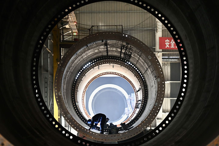 2024年4月23日,新疆木壘哈薩克自治縣民生工業(yè)園區(qū)木壘泰勝風(fēng)能裝備有限公司工人在生產(chǎn)線上生產(chǎn)風(fēng)力發(fā)電機(jī)塔筒