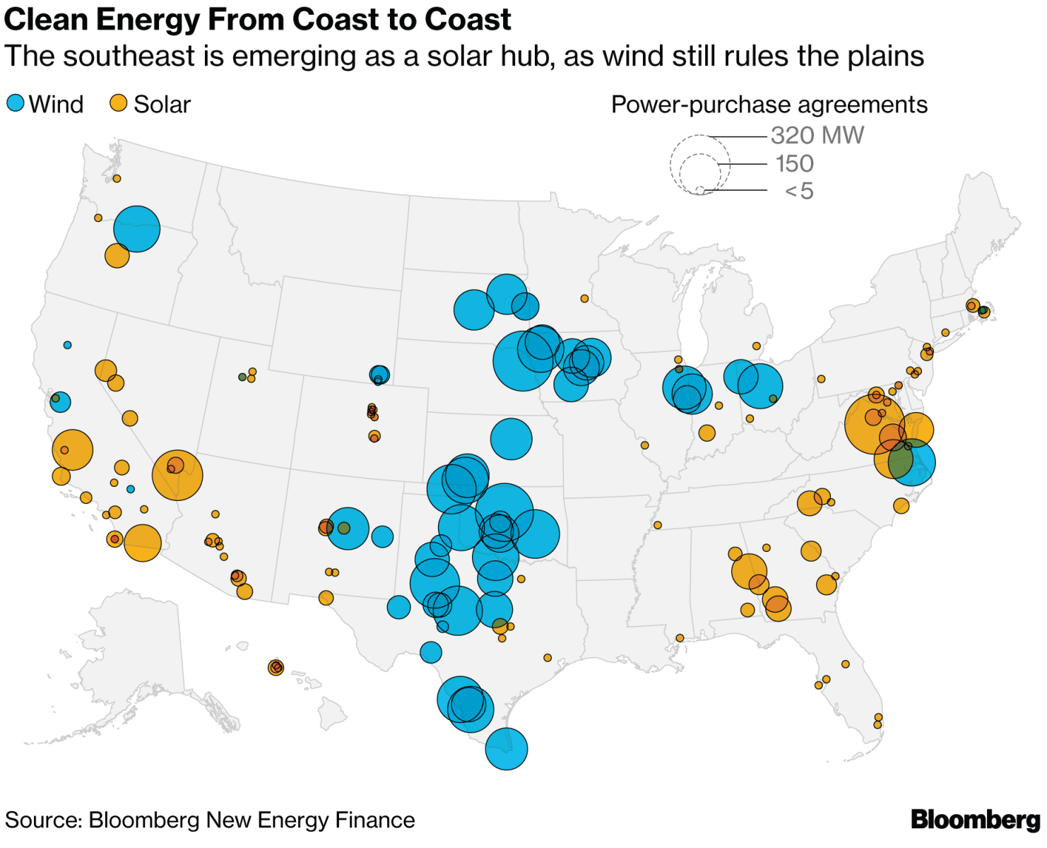 在美國簽署長期合同購買清潔能源的公司一般都在尋找風力發(fā)電的中心地帶和沿海國家的太陽能。