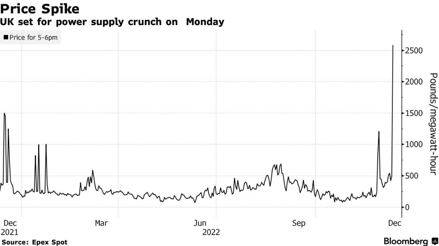 由于寒冷的氣溫將導(dǎo)致電力需求激增,再加上風(fēng)力發(fā)電量下降導(dǎo)致供應(yīng)短缺,英國電力價格周一飆升至創(chuàng)紀(jì)錄水平。據(jù)數(shù)據(jù)顯示,英國電力價格日前以創(chuàng)紀(jì)錄的每兆瓦時674.78英鎊結(jié)算,而周一電力價格則創(chuàng)下每兆瓦時2585.80英鎊的歷史新高。