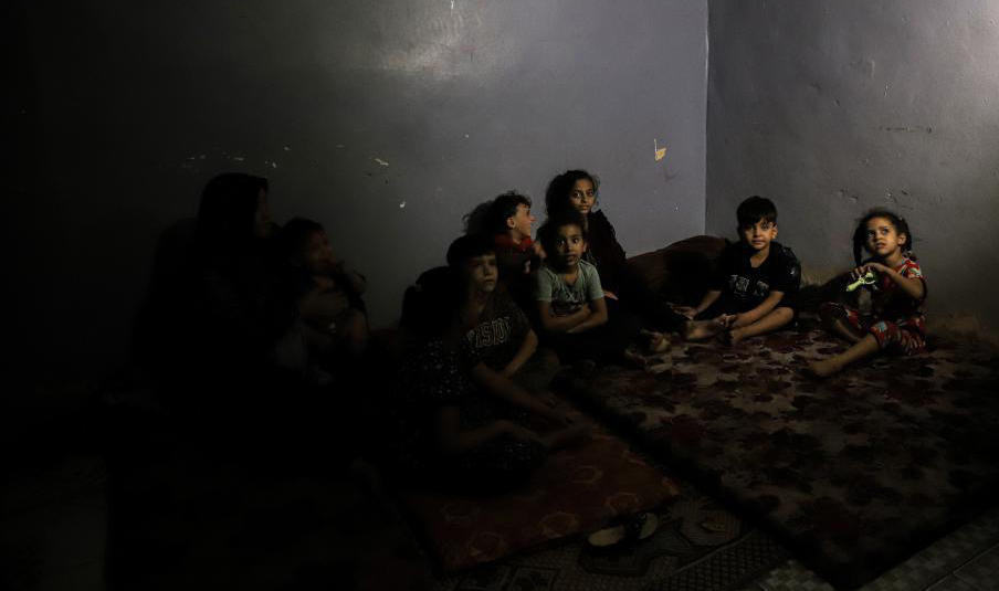 當(dāng)?shù)貢r(shí)間2023年10月16日,加沙地帶的汗尤尼斯,孩子們?cè)诤诎档姆块g中。