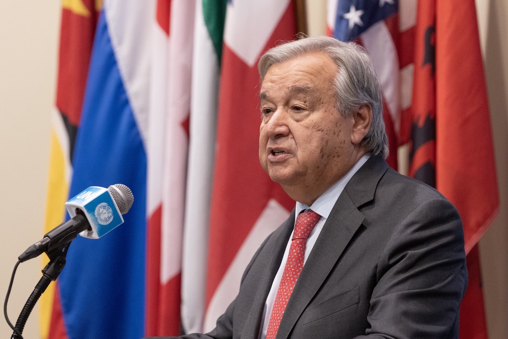 當(dāng)?shù)貢r(shí)間2023年10月13日,美國(guó)紐約,聯(lián)合國(guó)秘書(shū)長(zhǎng)古特雷斯在聯(lián)合國(guó)總部向媒體發(fā)表關(guān)于中東局勢(shì)的聲明。