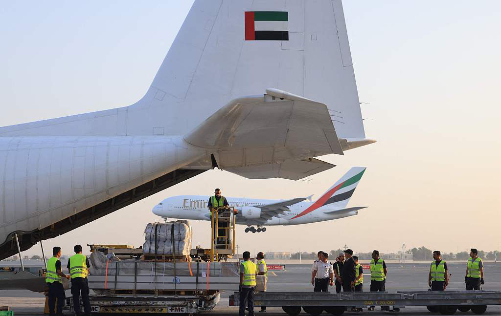 當(dāng)?shù)貢r(shí)間2023年10月17日,阿聯(lián)酋迪拜,阿聯(lián)酋向加沙地帶提供人道主義救援物資,運(yùn)輸機(jī)飛離迪拜機(jī)場(chǎng)。