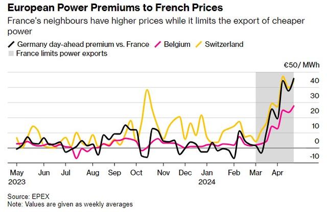 據(jù)法國電網(wǎng)運(yùn)營商RTE稱,自3月初以來,向比利時(shí)、德國、瑞士和意大利輸送電力的能力已經(jīng)減少。這使得這些國家無法進(jìn)口更便宜的法國核電,并推高了整個(gè)地區(qū)的批發(fā)價(jià)格。根據(jù)RTE的說法,這些限制應(yīng)該在5月初得到解決,但從8月中旬開始可能會(huì)有更多的限制。