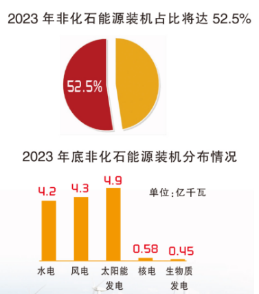 《報告》預(yù)計,在新能源發(fā)電快速發(fā)展帶動下,2023年新投產(chǎn)的總發(fā)電裝機以及非化石能源發(fā)電裝機規(guī)模將再創(chuàng)新高,其中全國新增發(fā)電裝機規(guī)模有望達到2.5億千瓦左右,新增非化石能源發(fā)電裝機1.8億千瓦。到2023年底,全國發(fā)電裝機達28.1億千瓦左右,非化石能源發(fā)電裝機合計14.8億千瓦,占總裝機比重上升至52.5%左右。其中,水電4.2億千瓦、并網(wǎng)風(fēng)電4.3億千瓦、并網(wǎng)太陽能發(fā)電4.9億千瓦、核電5846萬千瓦、生物質(zhì)發(fā)電4500萬千瓦左右,太陽能發(fā)電及風(fēng)電裝機規(guī)模將在2023年首超水電裝機規(guī)模 。