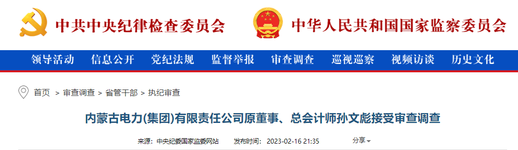 中央紀(jì)委國家監(jiān)委網(wǎng)站2月16日消息,據(jù)內(nèi)蒙古自治區(qū)紀(jì)委監(jiān)委消息:內(nèi)蒙古電力(集團(tuán))有限責(zé)任公司原董事、總會計師孫文彪涉嫌嚴(yán)重違紀(jì)違法,目前正接受內(nèi)蒙古自治區(qū)紀(jì)委監(jiān)委紀(jì)律審查和監(jiān)察調(diào)查。