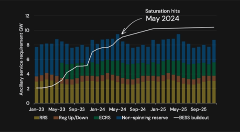 Modo Energy公司在美國(guó)儲(chǔ)能峰會(huì)上播放的演示幻燈片顯示了其預(yù)計(jì)德克薩斯州輔助服務(wù)市場(chǎng)何時(shí)飽和