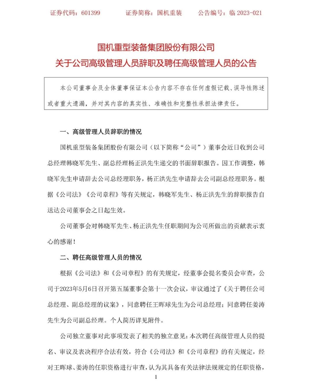5月8日,國機(jī)重裝發(fā)布公告,董事會近日收到公司總經(jīng)理韓曉軍、副總經(jīng)理?xiàng)钫檫f交的書面辭職報告。因工作調(diào)整,韓曉軍申請辭去公司總經(jīng)理職務(wù),楊正洪申請辭去公司副總經(jīng)理職務(wù)。