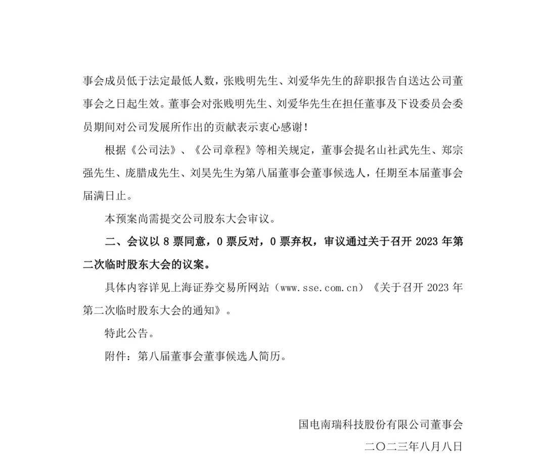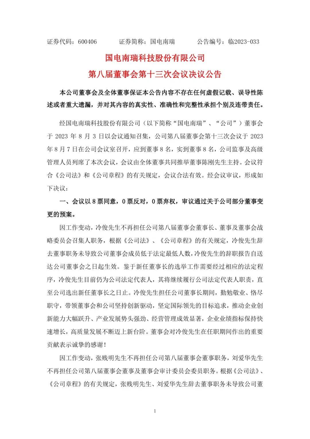 8月8日,國(guó)電南瑞科技股份有限公司發(fā)布公告稱,因工作變動(dòng),冷俊不再擔(dān)任公司第八屆董事會(huì)董事長(zhǎng)、董事及董事會(huì)戰(zhàn)略委員會(huì)召集人等職務(wù) ,但目前仍為公司法定代表人。