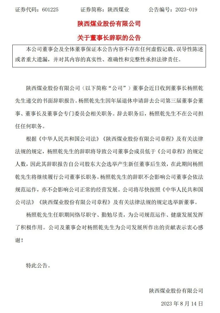 陜西煤業公告,公司董事會近日收到董事長楊照乾遞交的書面辭職報告。楊照乾因年屆退休申請辭去公司第三屆董事會董事、董事長及董事會專門委員會相關職務。