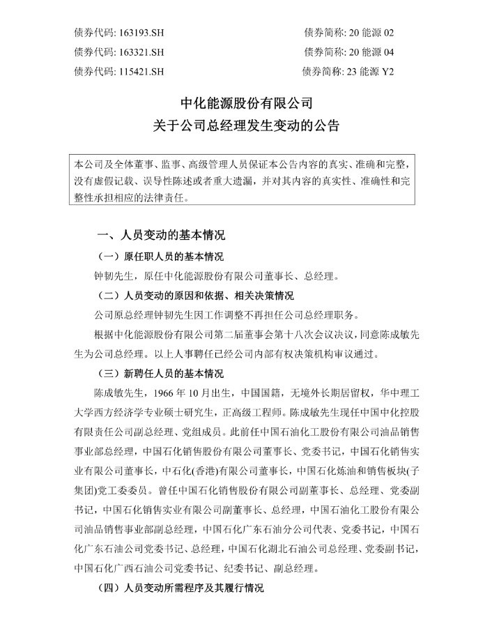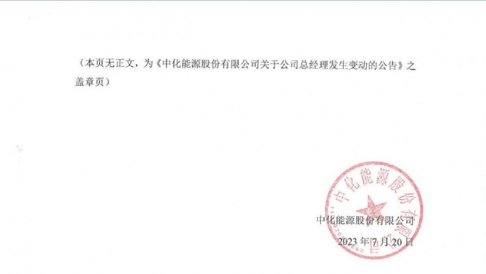 根據(jù)中化能源股份有限公司第二屆董事會第十八次會議決議,同意陳成敏為公司總經(jīng)理。