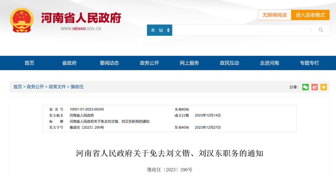 12月27日,河南省人民政府發(fā)布通知稱,免去劉文鍇的華北水利水電大學校長職務;免去劉漢東的華北水利水電大學副校長職務。