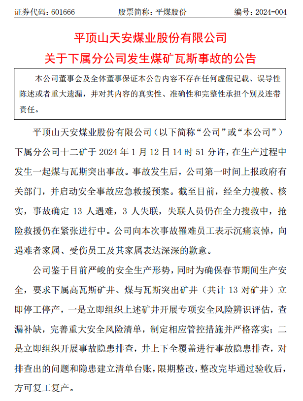 1月14日訊,平煤股份公告,下屬分公司十二礦于1月12日14時51分許,在生產(chǎn)過程中發(fā)生一起煤與瓦斯突出事故。截至目前,經(jīng)全力搜救、核實,事故確定13人遇難,3人失聯(lián),失聯(lián)人員仍在全力搜救中,搶險救援仍在緊張進(jìn)行中。
