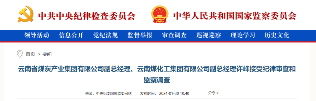 中央紀委國家監(jiān)委網(wǎng)站1月30日,據(jù)云南省紀委監(jiān)委消息:云南省煤炭產(chǎn)業(yè)集團有限公司副總經(jīng)理、云南煤化工集團有限公司副總經(jīng)理許峰涉嫌嚴重違紀違法,主動投案,目前正接受云南省紀委監(jiān)委紀律審查和監(jiān)察調查。