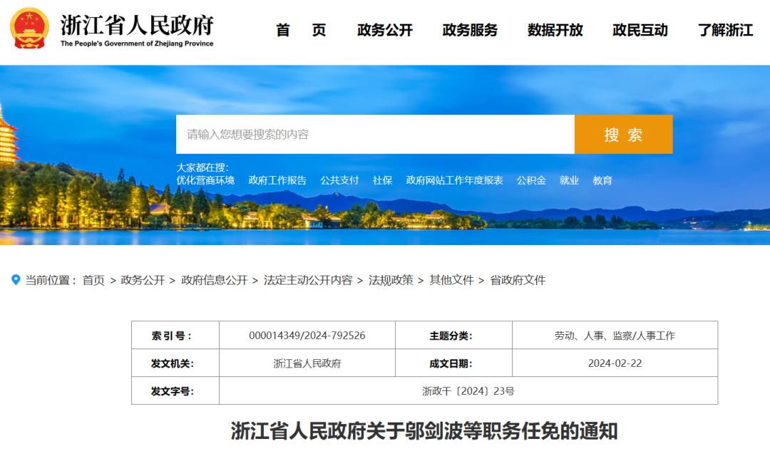 浙江省人民政府關(guān)于鄔劍波等職務(wù)任免的通知