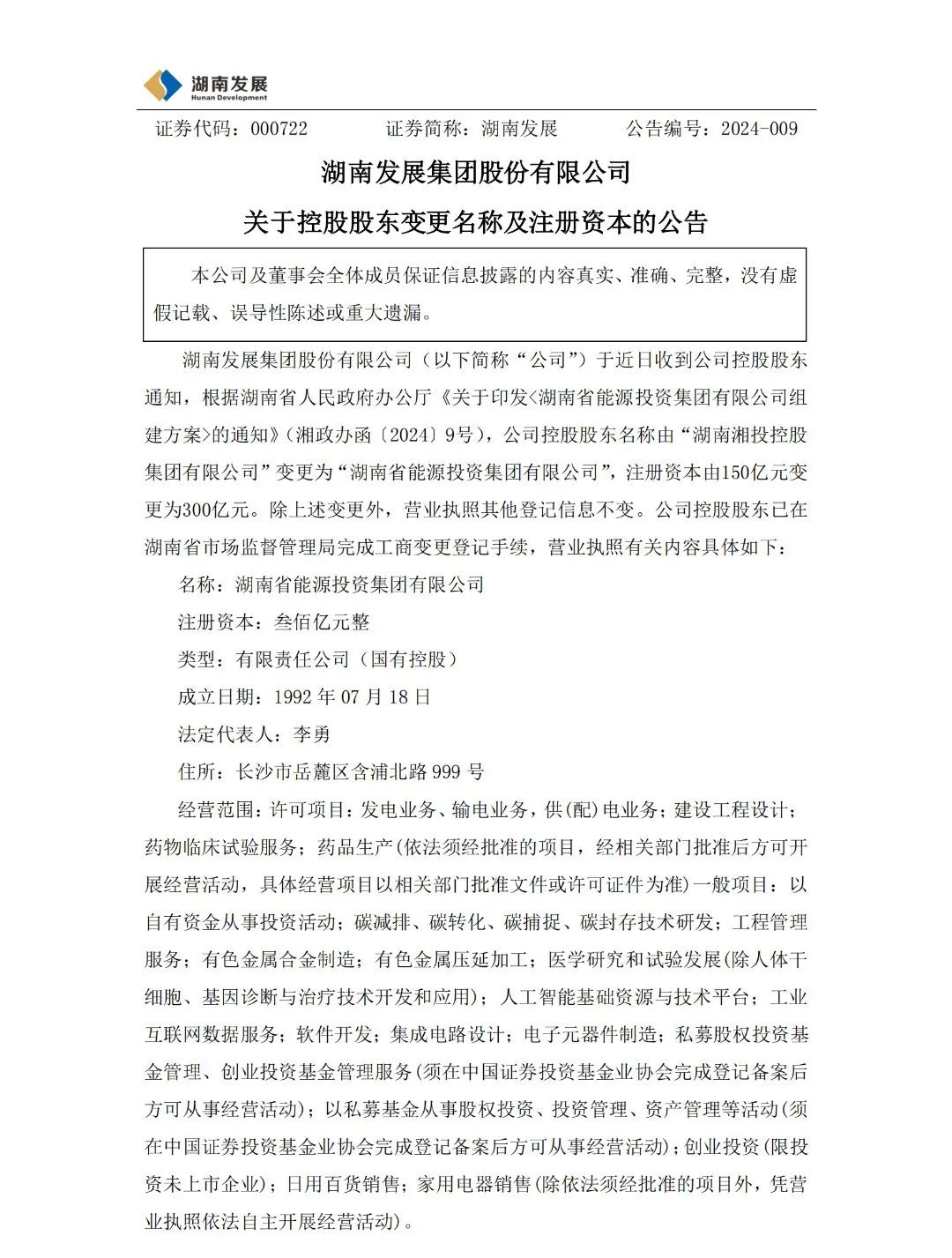 2月27日,湖南發(fā)展集團(tuán)股份有限公司發(fā)布關(guān)于控股股東變更名稱及注冊(cè)資本的公告,公告顯示:湖南發(fā)展集團(tuán)股份有限公司于近日收到公司控股股東通知,根據(jù)湖南省人民政府辦公廳《關(guān)于印發(fā)<湖南省能源投資集團(tuán)有限公司組建方案>的通知》(湘政辦函〔2024〕9號(hào)),公司控股股東名稱由“湖南湘投控股集團(tuán)有限公司”變更為“湖南省能源投資集團(tuán)有限公司”,注冊(cè)資本由150億元變更為300億元。除上述變更外,營業(yè)執(zhí)照其他登記信息不變。公司控股股東已在湖南省市場(chǎng)監(jiān)督管理局完成工商變更登記手續(xù)。