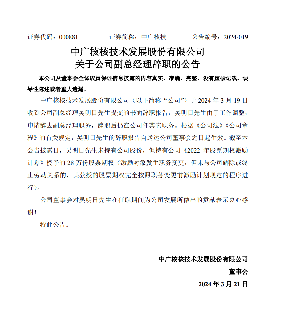 3月21日,中廣核技發(fā)布公告稱(chēng),公司于3月19日收到公司副總經(jīng)理吳明日先生提交的書(shū)面辭職報(bào)告,吳明日先生由于工作調(diào)整,申請(qǐng)辭去副總經(jīng)理職務(wù),辭職后仍在公司任其它職務(wù)。