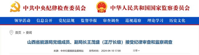 中央紀(jì)委國家監(jiān)委網(wǎng)站4月10日,據(jù)山西省紀(jì)委監(jiān)委消息:山西省能源局黨組成員、副局長王茂盛(正廳長級)涉嫌嚴(yán)重違紀(jì)違法,目前正接受山西省紀(jì)委監(jiān)委紀(jì)律審查和監(jiān)察調(diào)查。