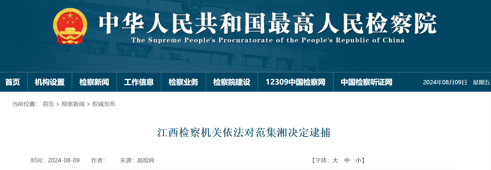 中國電力建設集團有限公司原黨委副書記、董事長范集湘涉嫌受賄、利用影響力受賄一案,由江西省監(jiān)察委員會調(diào)查終結(jié),移送檢察機關(guān)審查起訴。日前,經(jīng)最高人民檢察院指定管轄,江西省南昌市人民檢察院依法以涉嫌受賄罪、利用影響力受賄罪對范集湘作出逮捕決定。案件正在進一步辦理中。