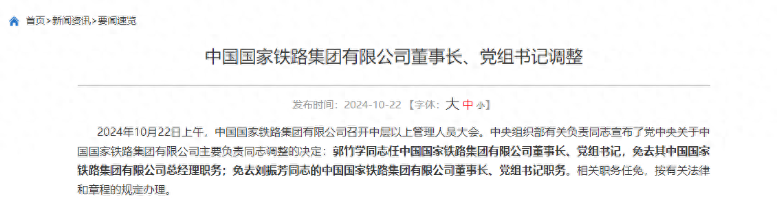 中央組織部有關(guān)負責同志宣布了黨中央關(guān)于中國國家鐵路集團有限公司主要負責同志調(diào)整的決定:郭竹學(xué)同志任中國國家鐵路集團有限公司董事長、黨組書記,免去其中國國家鐵路集團有限公司總經(jīng)理職務(wù);免去劉振芳同志的中國國家鐵路集團有限公司董事長、黨組書記職務(wù)。