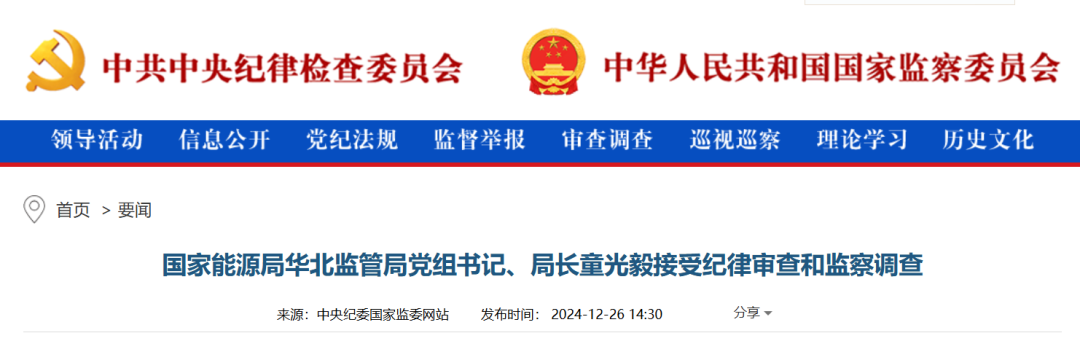 中央紀(jì)委國(guó)家監(jiān)委網(wǎng)站12月26日消息,據(jù)中央紀(jì)委國(guó)家監(jiān)委駐國(guó)家發(fā)展改革委紀(jì)檢監(jiān)察組、內(nèi)蒙古自治區(qū)紀(jì)委監(jiān)委消息:國(guó)家能源局華北監(jiān)管局黨組書記、局長(zhǎng)童光毅涉嫌嚴(yán)重違紀(jì)違法,目前正接受中央紀(jì)委國(guó)家監(jiān)委駐國(guó)家發(fā)展改革委紀(jì)檢監(jiān)察組紀(jì)律審查和內(nèi)蒙古自治區(qū)包頭市監(jiān)察委員會(huì)監(jiān)察調(diào)查。
