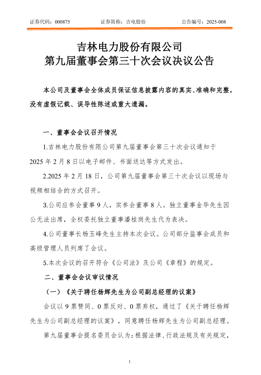 2月18日,吉電股份發(fā)布公告稱,公司第九屆董事會第三十次會議審議通過了《關(guān)于聘任楊輝先生為公司副總經(jīng)理的議案》,同意聘任楊輝先生為公司副總經(jīng)理。