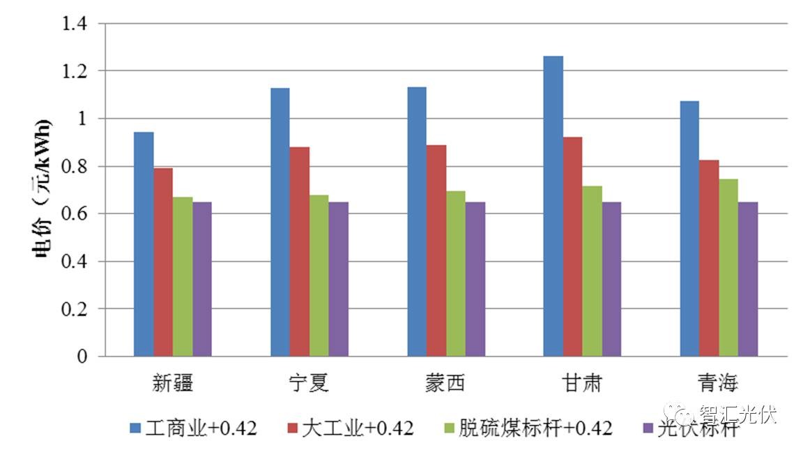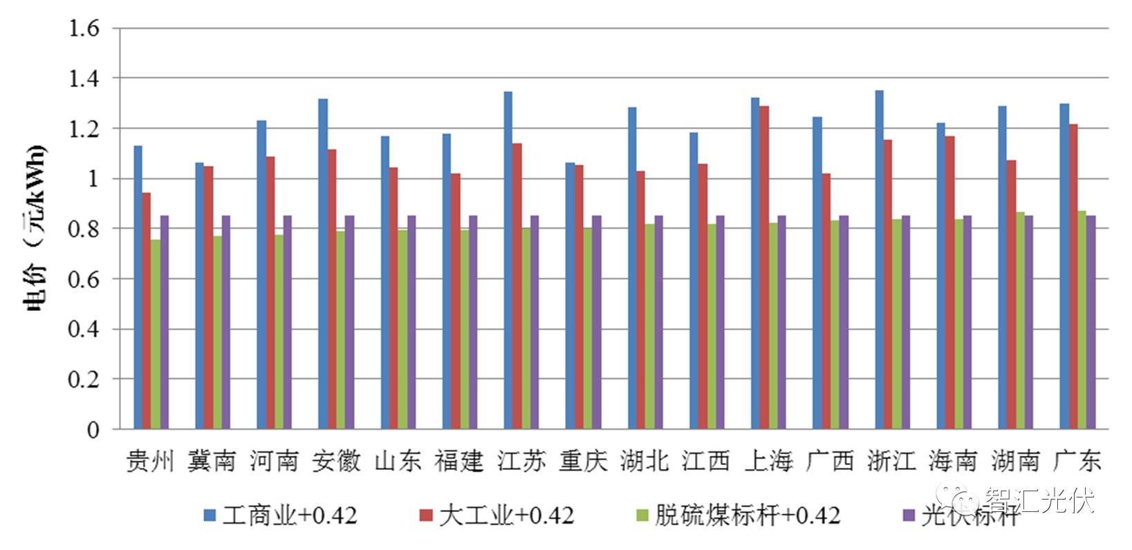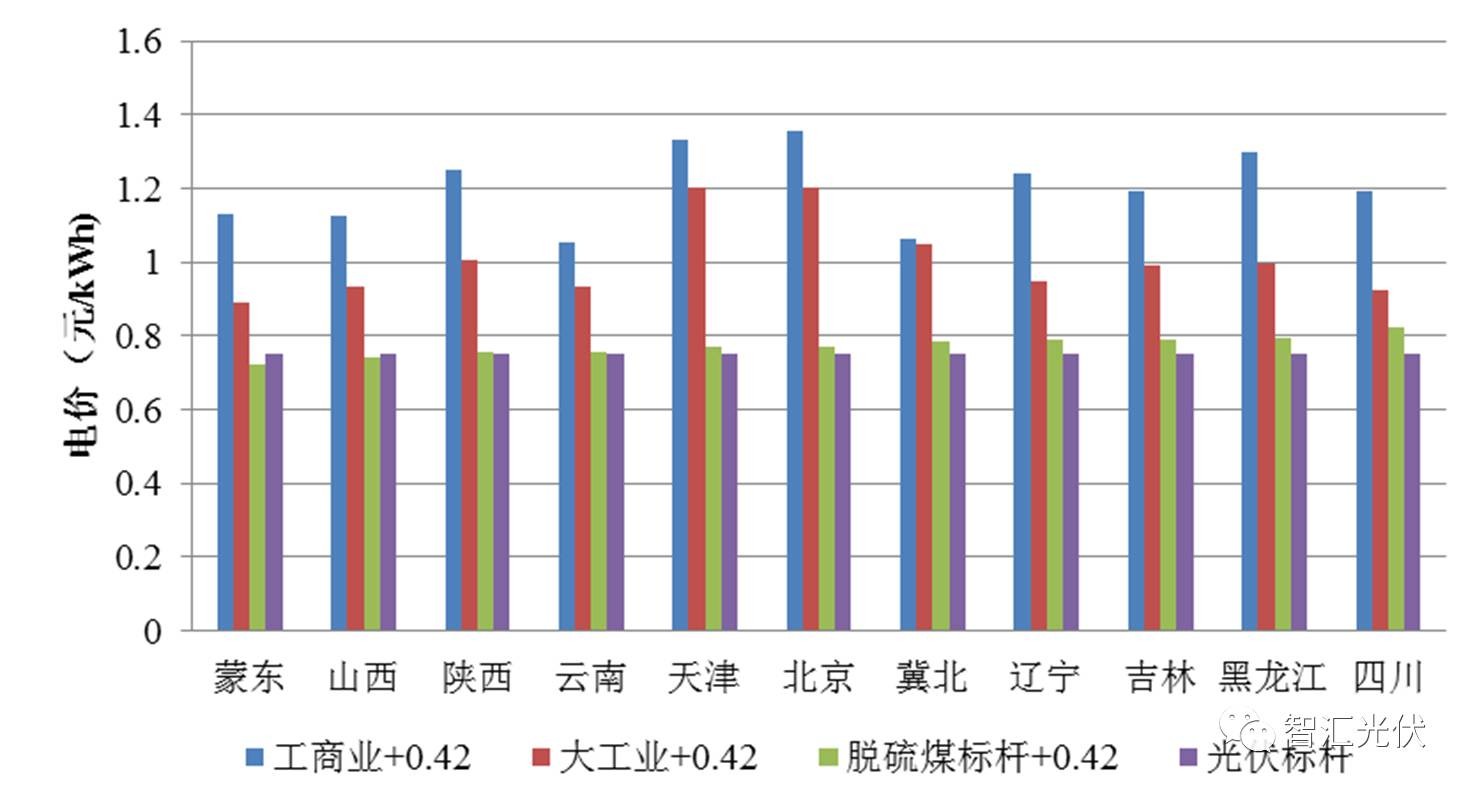 可以看出: “工商業(yè)+0.42”比0.65元/kWh高0.29~0.61元/kWh “大工業(yè)+0.42”比0.65元/kWh高0.14~0.27元/kWh 脫硫煤+0.42”比0.65元/kWh高0.02~0.095元/kWh 即在Ⅰ 類資源區(qū),無論是在工商業(yè)屋頂,還是大工業(yè)屋頂,“自發(fā)自用電價(jià)”、“余電上網(wǎng)電價(jià)“均高于當(dāng)?shù)氐摹叭~上網(wǎng)”標(biāo)桿電價(jià)0.65元/kWh。