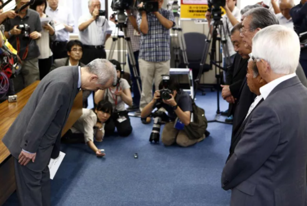 2013年8月29日,在日本東京,日本東京電力公司社長廣瀨直己(左)向全國漁業(yè)協(xié)會聯(lián)合會的代表鞠躬道歉。日本福島第一核電站先前曝出儲水罐放射性污水大量泄漏事件,引發(fā)日本漁業(yè)團體擔憂和抗議。新華社/法新