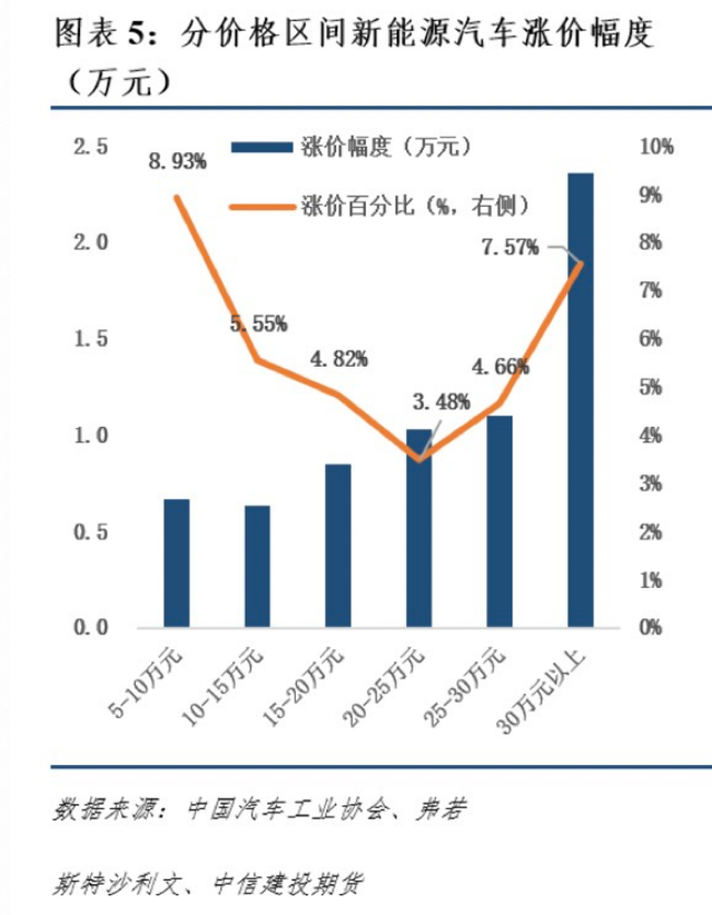筆者研究發(fā)現(xiàn),不同價(jià)格區(qū)間的新能源汽車漲幅是不同。根據(jù)中信建投今年5月的數(shù)據(jù)來看,售價(jià)為10-30萬元的新能源汽車漲幅較小,而5-10萬元的新能源汽車漲幅最大。