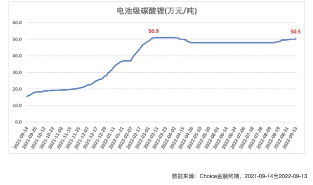 此外,此輪新能源汽車的價(jià)格上漲還和新能源汽車上游原材料價(jià)格的上漲有關(guān)。目前,中國市場電池級(jí)碳酸鋰價(jià)格已從2021年初的6萬元/噸上漲到近期的50萬元/噸。