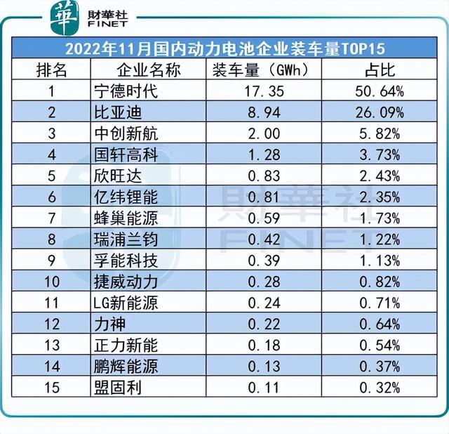 寧德時代(300750.SZ)在2022年1-11月動力電池的累計(jì)裝機(jī)量124GWh,國內(nèi)市占率48.02%,比位居第二的比亞迪23.11%的市占率、第三的中創(chuàng)新航6.73%的市占率要高出不少。