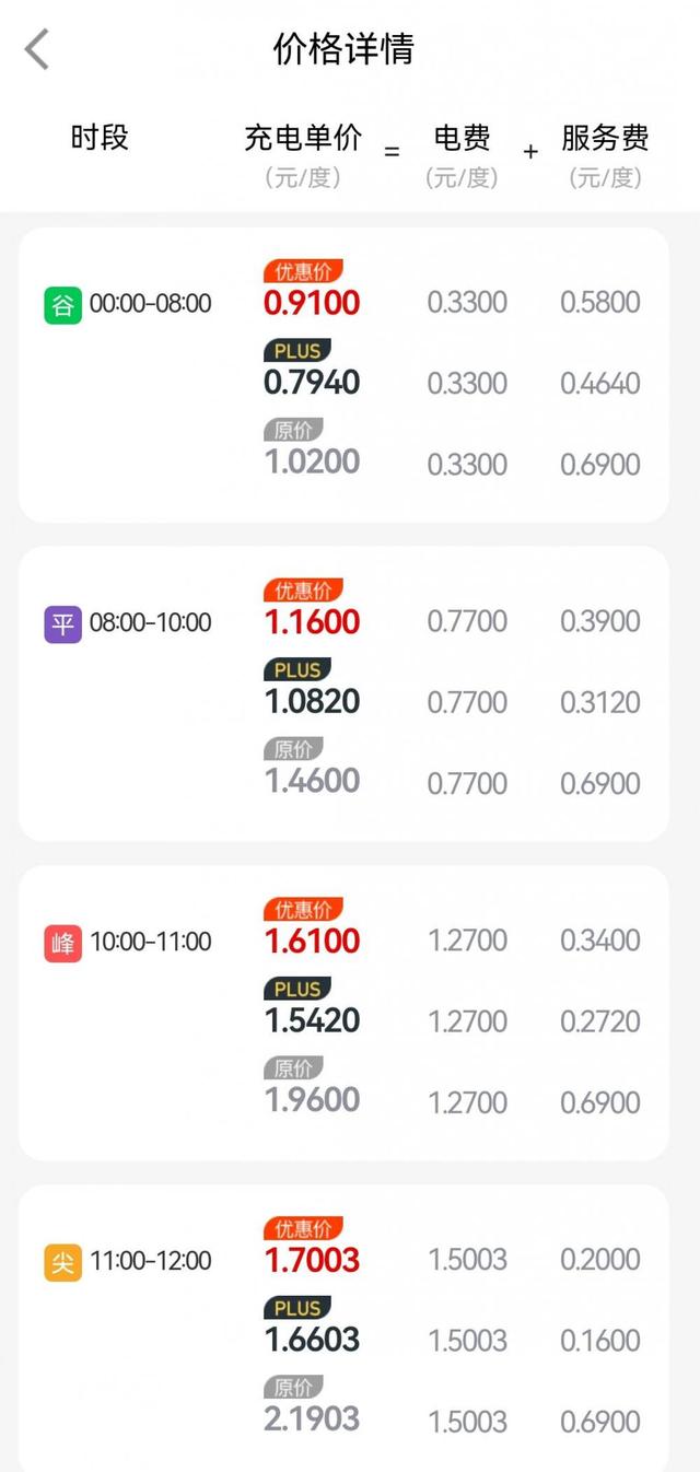 充電樁“峰谷分時”電價時段會有“峰、谷、平”三個價位,分別代表用電的高峰期、低谷期和正常用電期。中午時分,一般是充電的平時時段,價格較低。