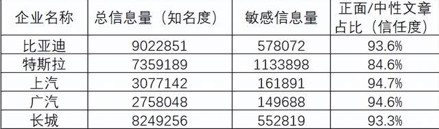 根據(jù)人民數(shù)據(jù)資產(chǎn)服務(wù)平臺數(shù)據(jù)顯示,截至2023年9月底,比亞迪、特斯拉、上汽、廣汽、長城的總信息量(知名度)和正面/中性文章占比(信任度)呈現(xiàn)出一定的特點(diǎn)。