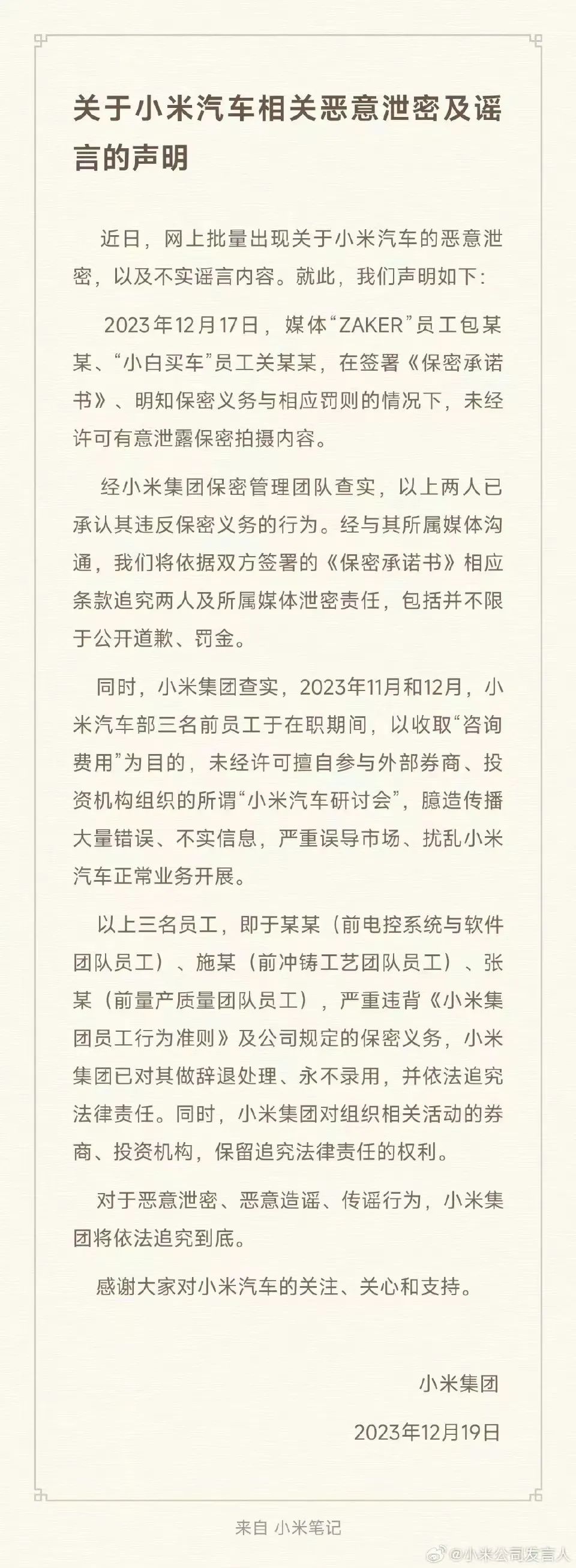 12月19日晚,小米科技有限責任公司官方微博“小米公司發言人”發布了《關于小米汽車相關惡意泄密及謠言的聲明》。小米表示,將追究2名媒體人的泄密責任,同時,對3名擅自參與外部機構所謂“小米汽車研討會”、臆造傳播大量錯誤不實信息誤導市場的前員工進行辭退處理、永不錄用,并依法追究法律責任。