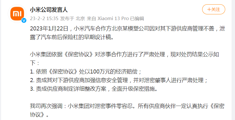 《聲明》稱,2023年12月17日,媒體“ZAKER”員工包某某、“小白買車”員工關某某,在簽署《保密承諾書》、明知保密義務與相應罰則的情況下,未經許可有意泄露保密拍攝內容。經小米集團保密管理團隊查實,以上兩人已承認其違反保密義務的行為。經與其所屬媒體溝通,小米集團將依據雙方簽署的《保密承諾書》相應條款追究兩人及所屬媒體泄密責任,包括并不限于公開道歉、罰金。另外,《聲明》介紹,2023年11月和12月,小米汽車部三名前員工于在職期間,以收取“咨詢費用”為目的,未經許可擅自參與外部券商、投資機構組織的所謂“小米汽車研討會”,臆造傳播大量錯誤、不實信息,嚴重誤導市場、擾亂小米汽車正常業務開展。以上三名員工,即于某某(前電控系統與軟件團隊員工)、施某(前沖鑄工藝團隊員工)、張某(前量產質量團隊員工),嚴重違背《小米集團員工行為準則》及公司規定的保密義務,小米集團已對其做辭退處理、永不錄用,并依法追究法律責任。同時,小米集團表示,對組織相關活動的券商、投資機會,保留追究法律責任的權利。小米汽車始終吸引市場高度關注,這也不是小米集團第一次遭遇汽車泄密。今年1月22日,小米汽車合作方北京某模塑科技有限公司因對其下游供應商管理不善,泄露了小米汽車前后保險杠的早期設計稿。“小米公司發言人”微博今年2月更新了該泄密事件的處理結果:小米集團表示,已依據《保密協議》對涉事合作方進行了嚴肅處理,包括依照《保密協議》處以100萬元的經濟賠償;責成其對下游供應商加強信息安全管理,并對泄密肇事人進行嚴肅處理;責成供應商制定詳細整改方案,全面升級保密措施。