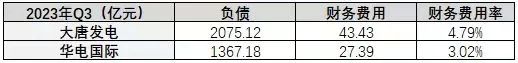 大唐資產(chǎn)投入更高,負(fù)債也更高。截至2023年三季度末,大唐負(fù)債總規(guī)模已超2000億,前三季度僅財(cái)務(wù)費(fèi)用就高達(dá)43.43億,比華電大約多了16億。