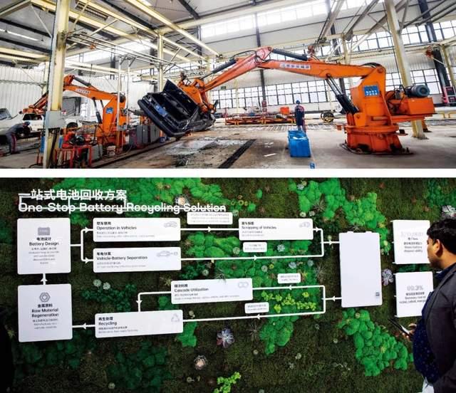 下圖:2023年4月,在上海車(chē)展期間,寧德時(shí)代展示的一站式電池回收方案。圖/視覺(jué)中國(guó)